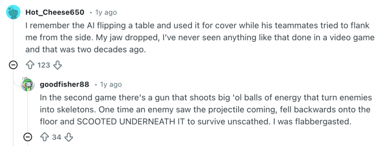 By the early 2000s, AAA game companies developing titles such as F.E.A.R. raised the bar again. Enemies seemed coordinated. They took cover, flanked, shouted to each other. Players described them as “smart.” In reality, these behaviors were driven by structured decision trees. Complex, yes. Adaptive, no. And yet, 20 years later, people on Reddit claim that it was the best AI in FPS games ever.