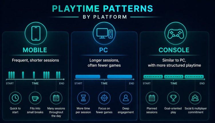 How that time is distributed depends a lot on the platform. Mobile tends to break into short sessions – a few minutes here and there, repeated during the day. PC and console look different. Fewer sessions, but longer ones, often tied to specific titles rather than constant switching.