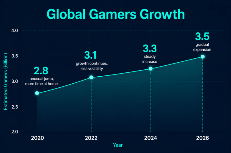 If you look for a single number, you’ll find a range instead. Most estimates for 2026 land somewhere around 3.4 to 3.6 billion people who play games in one form or another. The gap comes from how “playing” is defined. A few minutes on mobile once in a while may count in one dataset and not in another.