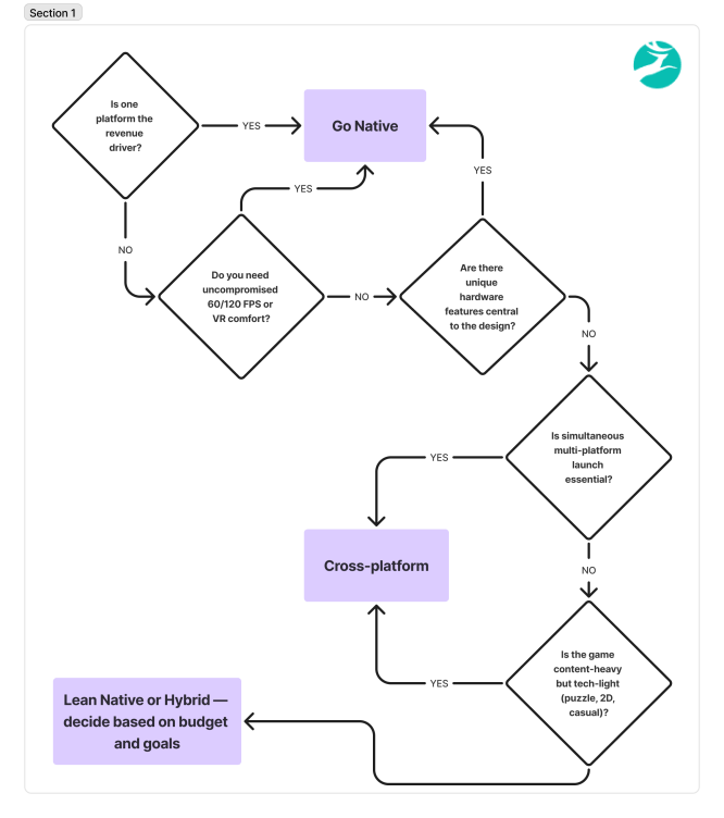 To help decide whether to go native or cross-platform, we’ve prepared a quick decision tree. It guides you through questions like: Is performance critical? Is a multi-platform release a must? Is platform identity part of your strategy? Depending on your answers, you’ll see whether native development or cross-platform game development services are the better fit.